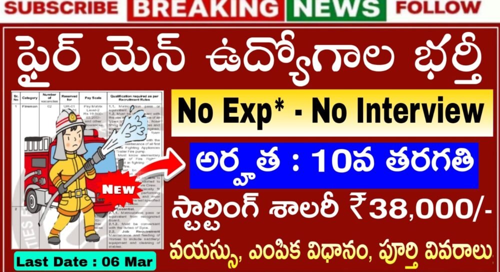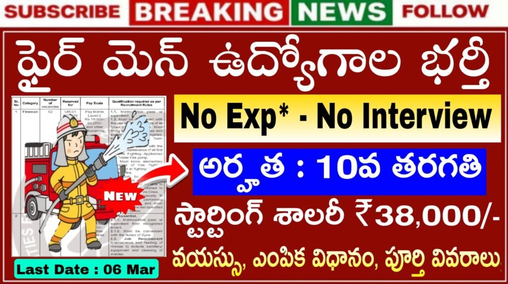 •Fireman :: మెట్రిక్యులేషన్ పాస్ లేదా తత్సమానం ఆర్పే యంత్రాల రకాలు, అన్ని బి. ఫిట్టింగ్లు మరియు అగ్నిమాపక ఉపకరణాలు మరియు అగ్నిమాపక యంత్రాలు, ట్రైలర్ ఫైర్ పంప్, ఫోమ్ బ్రాంచ్లు మొదలైన వాటి వాడకం మరియు నిర్వహణ గురించి అవగాహన కలిగి ఉండాలి. అన్ని ప్రథమ చికిత్స అగ్నిమాపక ఉపకరణాలు మరియు ట్రైలర్ ఫైర్ పంపుల వాడకం మరియు నిర్వహణ గురించి తెలిసి ఉండాలి.