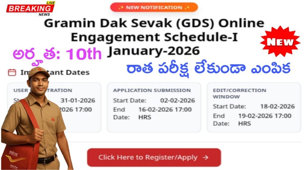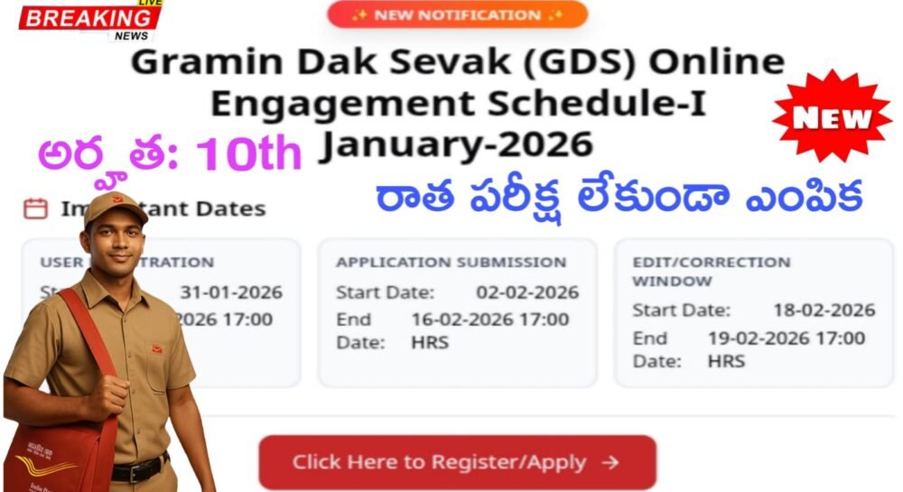 దేశవ్యాప్తంగా వివిధ గ్రామాలలో ఖాళీగా ఉన్న 28,740 గ్రామీణ డాగ్ సేవకు జిడిఎస్ పోస్టు దరఖాస్తు ప్రక్రియ నేటితో ముగిస్తుంది. ఈ ఉద్యోగానికి రిజిస్ట్రేషన్ చేసుకోవడానికి చివర తేదీ ఫిబ్రవరి 14. అలాగే రిజిస్ట్రేషన్ చేసుకొని ఇంకా అప్లికేషన్ పూర్తి చేయని అభ్యర్థుల కోసం ఫిబ్రవరి 16 వరకు దరఖాస్తు సమర్పణ ఉటుంది. అర్హత కలిగిన అభ్యర్థులు ఇండియన్ పోస్టల్ అధికారి వెబ్సైట్ ద్వారా https://www.indiapost.gov.in/gdsonlineengagement  సందర్శించి అర్హులు అయితే వెంటనే ఆలస్యం చేయకుండా అప్లై చేసుకోండి. అప్లికేషన్ చేస్తున్న సమయంలో ఏదైనా తప్పులు చేసి ఉన్నట్లయితే ఎడిట్ ఆప్షన్ ఇండియన్ పోస్టల్ ఫిబ్రవరి 18, 19, 2026 మధ్య ఎడిటింగ్ విండోను (విండోను సవరించండి/సవరించండి) ఓపెన్ కావడం జరుగుతుంది. ఆ తేదీలను తమ అప్లికేషన్ను ఎడిట్ చేసుకొని అవకాశం ఉంటుంది.