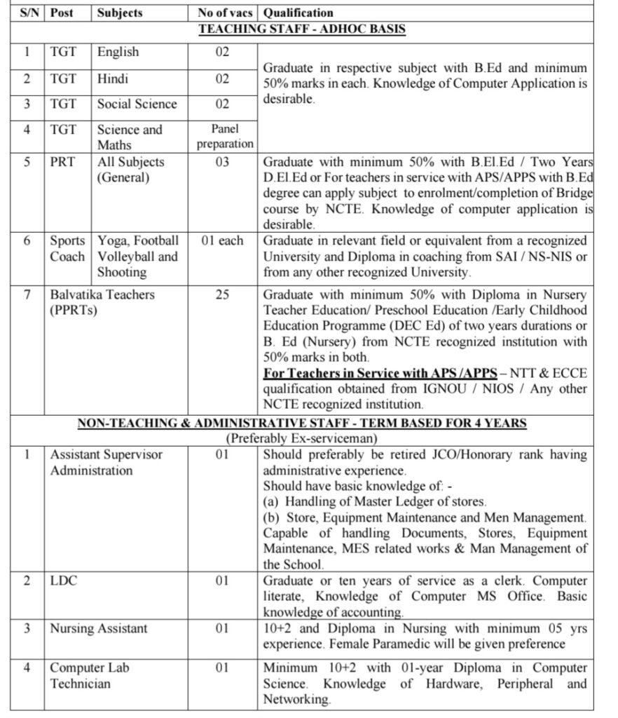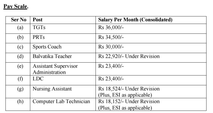•విభాగాల వారీగా ఖాళీలు: TGT, PRT, స్పోర్ట్స్ కోచ్, అసిస్టెంట్ సూపర్వైజర్ అడ్మినిస్ట్రేషన్, LDC, నర్సింగ్ అసిస్టెంట్ & కంప్యూటర్ ల్యాబ్ టెక్నీషియన్ పోస్టులు ఉన్నాయి.