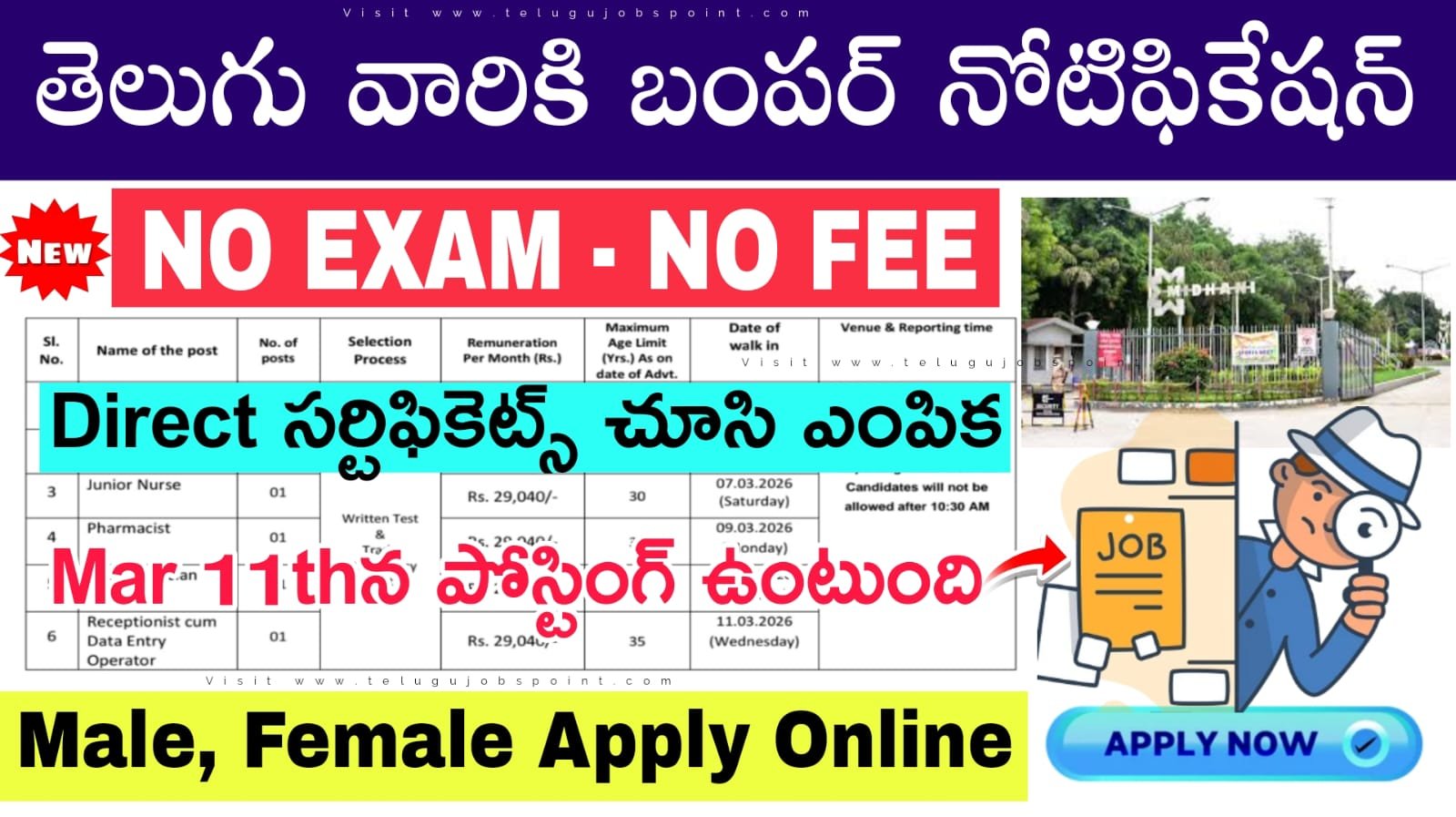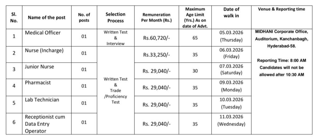 మిధాని ప్రైమరీ హెల్త్ కేర్ సెంటర్ ట్రస్ట్ అధికారిక వెబ్‌సైట్ https://midhani-india.in/ లో ఫిబ్రవరి 19, 2026న దరఖాస్తు నోటిఫికేషన్ అప్లోడ్ చేశారు. MIDHANIఅర్హత ప్రమాణాలను పూర్తి చేసిన అభ్యర్థులు వాక్-ఇన్ -ఇంటర్వ్యూ ద్వారా ఎంపిక చేస్తారు.