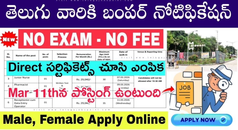 MIDHANI నోటిఫికేషన్ 2026 ను మిధాని ప్రైమరీ హెల్త్ కేర్ సెంటర్ ట్రస్ట్ అధికారిక వెబ్‌సైట్ midhani-india.in లో విడుదల చేసింది. MIDHANI రిక్రూట్‌మెంట్ 2026 ద్వారా మొత్తం 06 ఖాళీలను ప్రకటించారు. కనీసం అనుసరించి డిగ్రీ, పీజీ, బీఎస్సీ నర్సింగ్ ఉన్న 18 నుండి 35 సంవత్సరాల మధ్య వయస్సు గల అభ్యర్థులు MIDHANI మెడికల్ ఆఫీసర్, నర్సు (ఇన్ఛార్జ్), జూనియర్ నర్సు, ఫార్మసిస్టు, ల్యాబ్ టెక్నీషియన్, రిసెప్షనిస్ట్ కమ్ డేటా ఎంట్రీ ఆపరేటర్ పోస్టుకు అర్హులు. MIDHANI 2026 కోసం దరఖాస్తు విండో ప్రారంభమైంది మరియు ఇది పోస్టులను అనుసరించి మార్చి 5 నుంచి 11 వరకు వాక్-ఇన్ ఇంటర్వ్యూ కొనసాగుతుంది. ఈ వ్యాసంలో నోటిఫికేషన్ PDF కి డైరెక్ట్ లింక్‌ను మేము క్రింద అందించాము.