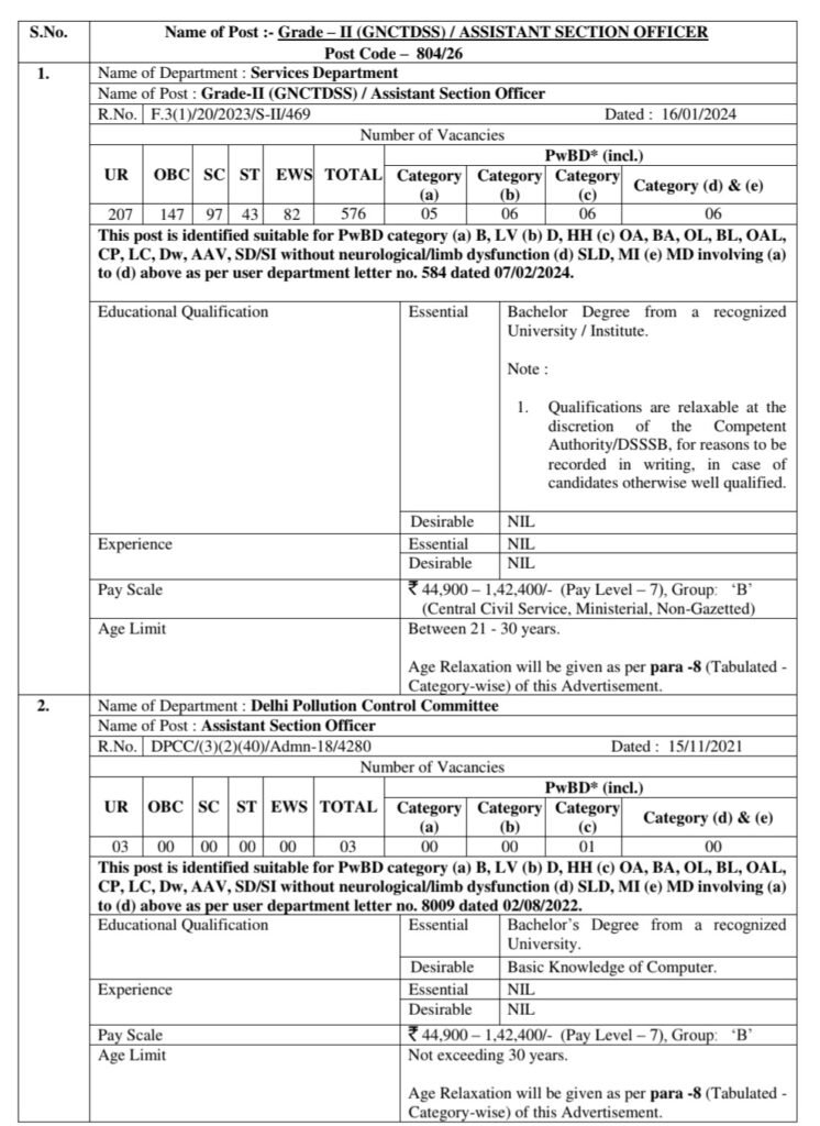 ఢిల్లీ సబార్డినేట్ సర్వీసెస్ సెలక్షన్ బోర్డ్ (DSSSB) లో ప్రభుత్వ విభాగాలు లో లీగల్ అసిస్టెంట్, అసిస్టెంట్ ఇంజనీర్ (సివిల్), జూనియర్ ఇంజనీర్ (సివిల్) & గ్రేడ్ – II (GNCTDSS)/అసిస్టెంట్ సెక్షన్ ఆఫీసర్ ఖాళీల భర్తీకి అర్హులైన అభ్యర్ధుల నుంచి దరఖాస్తులు కోరుతూ DSSSB నోటిఫికేషన్ విడుదల చేసింది. ఈ నోటిఫికేషన్ కింద మొత్తం 911 పోస్టులను భర్తీ చేయనుంది. Any డిగ్రీ అర్హత కలిగిన అభ్యర్ధులు ఎవరైనా దరఖాస్తు చేసుకోవచ్చు. అర్హత కలిగిన అభ్యర్థులు దరఖాస్తు ప్రారంభ తేదీ: 24/02/2026 (ఫిబ్రవరి 24, 2026) (మధ్యాహ్నం 12.00 గంటల నుండి) దరఖాస్తుకు చివరి తేదీ: 25/03/2026 (25 మార్చి, 2026) (రాత్రి 11.59 గంటల వరకు) తేదీలోగా ఆన్లైన్ విధానంలో దరఖాస్తు చేసుకోవచ్చు.