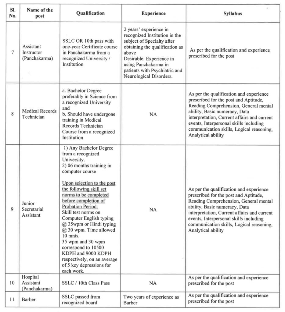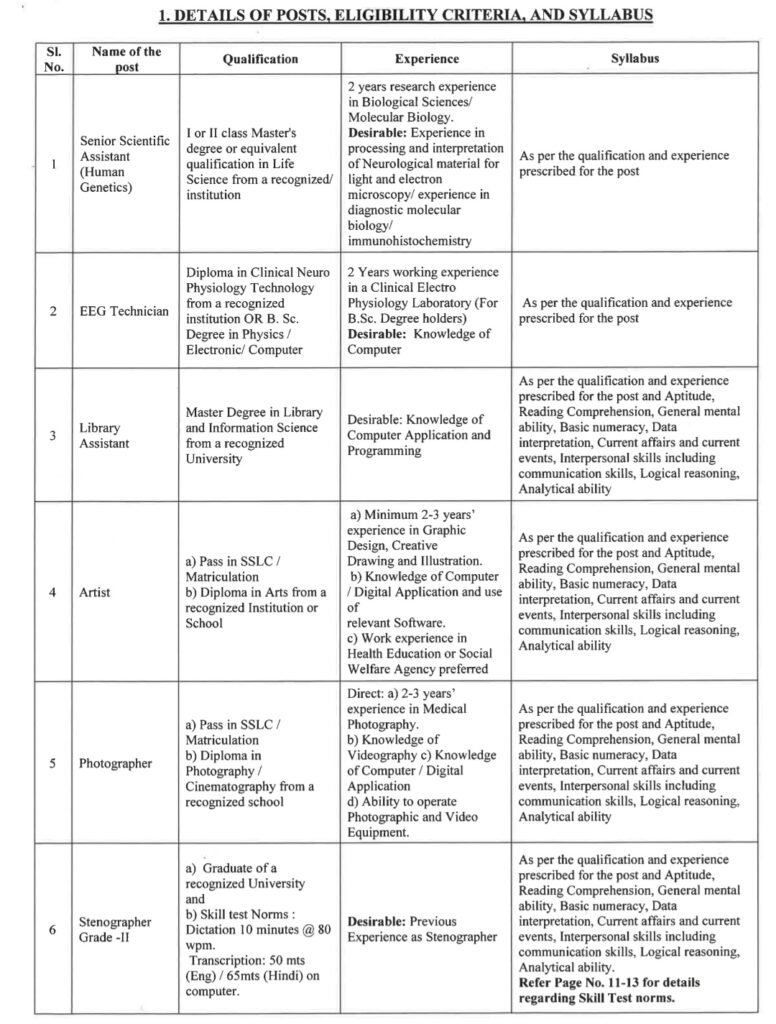 విభాగాల వారీగా ఖాళీలు: సీనియర్ సైంటిఫిక్ అసిస్టెంట్, ఈఈజీ టెక్నీషియన్, లైబ్రరీ అసిస్టెంట్, ఆర్టిస్ట్, ఫొటోగ్రాఫర్, స్టెనోగ్రాఫర్ గ్రేడ్-II, అసిస్టెంట్ ఇన్స్ట్రక్టర్, మెడికల్ రికార్డ్స్ టెక్నీషియన్, జూనియర్ సెక్రటేరియల్ అసిస్టెంట్, హాస్పిటల్ అసిస్టెంట్ & బార్బర్ తదితర ఉద్యోగాలు ఉన్నాయి.