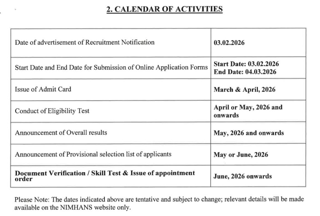 ఎలా అప్లై చేసుకోవాలి : ఆన్‌లైన్ దరఖాస్తులను https://nimhans.Intedutech.com/job-openings/recruitment-section 03.02.2026 లింక్ ద్వారా 04.03.2026 సాయంత్రం 4:30 గంటల వరకు సమర్పించవచ్చు. ఆన్‌లైన్ దరఖాస్తు ఫారమ్‌తో సహా ఏ పత్రాలను భౌతిక రూపంలో పంపాల్సిన అవసరం లేదు. రిజిస్ట్రేషన్‌కు సంబంధించిన ఏ రకమైన భౌతిక పత్రం చెల్లదు మరియు చెల్లదు మరియు నాశనం చేయబడుతుంది. అయితే, దరఖాస్తుదారులందరూ తమ రికార్డుల కోసం చెల్లింపు రుజువుతో పాటు దరఖాస్తు ఫారమ్ కాపీని తమ వద్ద ఉంచుకోవాలని సూచించారు.