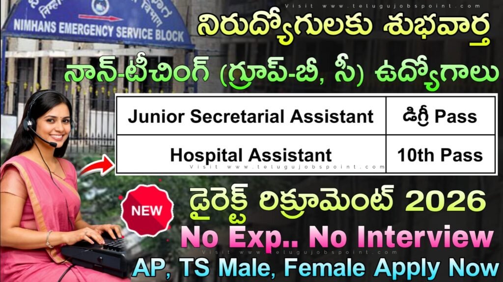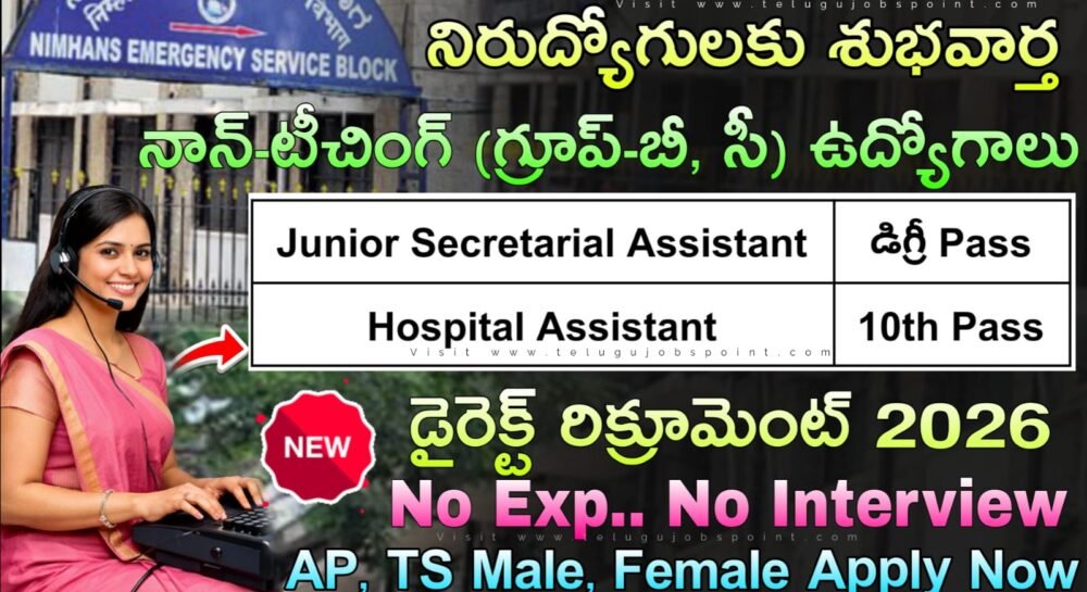 Latest NIMHANS Recruitment2026 Latest Junior Secretarial Assistant & Hospital Assistant Notification 2026 Apply Now : నేషనల్ ఇన్స్టిట్యూట్ ఆఫ్ మెంటల్ హెల్త్ అండ్ న్యూరో సైన్సెస్ (NIMHANS) లో సీనియర్ సైంటిఫిక్ అసిస్టెంట్, ఈఈజీ టెక్నీషియన్, లైబ్రరీ అసిస్టెంట్, ఆర్టిస్ట్, ఫొటోగ్రాఫర్, స్టెనోగ్రాఫర్ గ్రేడ్-II, అసిస్టెంట్ ఇన్స్ట్రక్టర్, మెడికల్ రికార్డ్స్ టెక్నీషియన్, జూనియర్ సెక్రటేరియల్ అసిస్టెంట్, హాస్పిటల్ అసిస్టెంట్ & బార్బర్ నాన్-టీచింగ్ (గ్రూప్-బీ, సీ) పోస్టుల భర్తీకి దరఖాస్తులు కోరుతోంది.