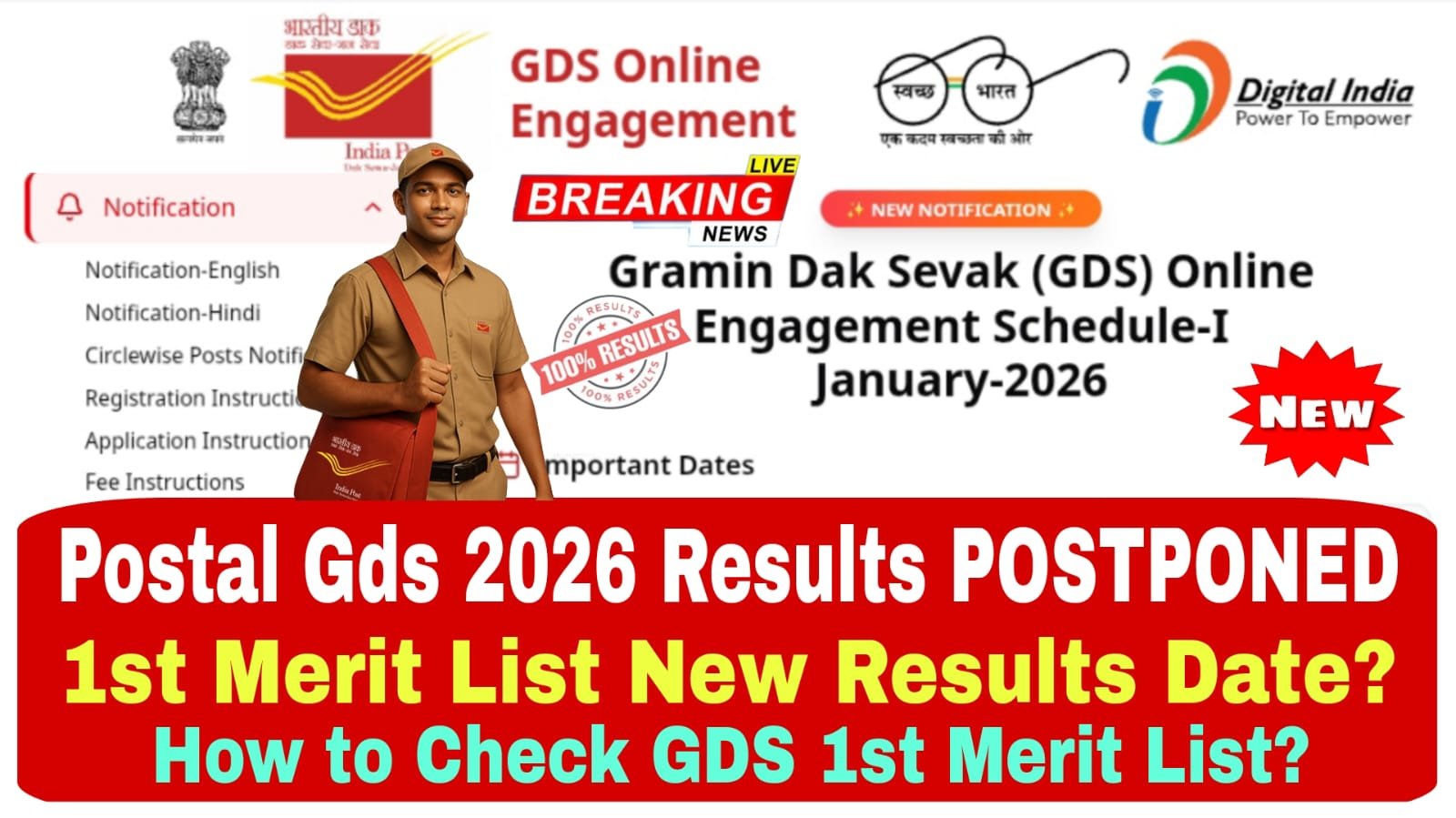 India Post GDS 1st Merit List 2026 : భారతదేశవ్యాప్తంగా వివిధ పోస్ట్ గ్రామీణ పోస్టల్ ఆఫీసుల్లో 28,635 గ్రామీణ డాగ్ సేవక్ (GDS) ఉద్యోగులకు దరఖాస్తు చేసుకున్నా అభ్యర్థులకు గుడ్ న్యూస్.. ఈ ఉద్యోగాలకు విద్య అర్హత మెరిట్ ఆధారంగా షార్ట్ లిస్ట్ చేస్తారు. ఫలితాలు పూర్తిగా కంప్యూటర్ జనరేటర్ ద్వారా క్రియేట్ చేయడం జరుగుతుంది. ఈ ఉద్యోగాలకు మార్చి మొదటి వారంలో India Post GDS 1St Merit List 2026 విడుదలయ్యే అవకాశం ఉంటుంది దరఖాస్తు చేసుకున్న అభ్యర్థులు జాబితా కోసం రిజిస్టర్ మొబైల్ లేదా ఈమెయిల్ చెక్ చేస్తూ ఉండండి. అలాగే https://indiapost.gov.in/gdsonlineengagement వెబ్సైట్లో కూడా మీరు చెక్ చేసుకోవచ్చు.