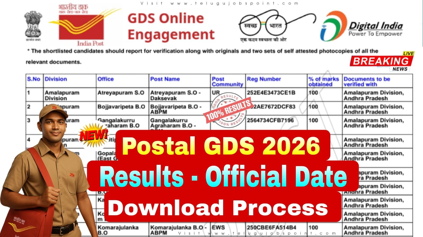 Postal gds results 2026 date : ఇండియా పోస్ట్ గ్రామీణ డాక్ సేవక్ (GDS) 1st మెరిట్ లిస్ట్ 2026 అధికార వెబ్సైట్ ద్వారా https://indiapost.gov.in/gdsonlineengagement విడుదల కావడం జరుగుతుంది.