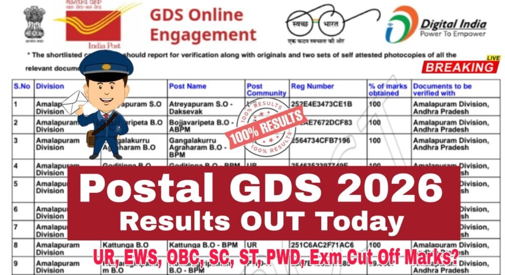 నిరుద్యోగ అభ్యర్థులు ఎంతో ఆసక్తిగా ఎదురు చూస్తున్నా పోస్టల్ జిడిఎస్ ఫలితాలు ఈరోజు మార్చ్ 3 నుంచి మార్చి ఏడు మధ్యలో ఈ క్షణంలోనైనా విడుదల అయ్యే అవకాశం ఉంది. అభ్యర్థులు అధికారక వెబ్సైట్ ద్వారా https://indiapost.gov.in/gdsonlineengagement షార్ట్ లిస్ట్ చేయబడిన అభ్యర్థుల GDS FIRST MERIT LIST Pdf  2026 సర్కిల్ మరియు రాష్ట్ర వారీగా జాబితా డౌన్లోడ్ చేసుకోవచ్చు.
