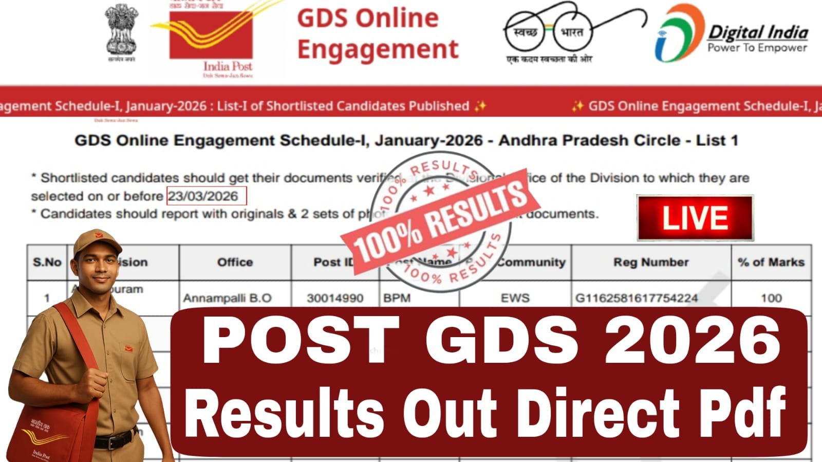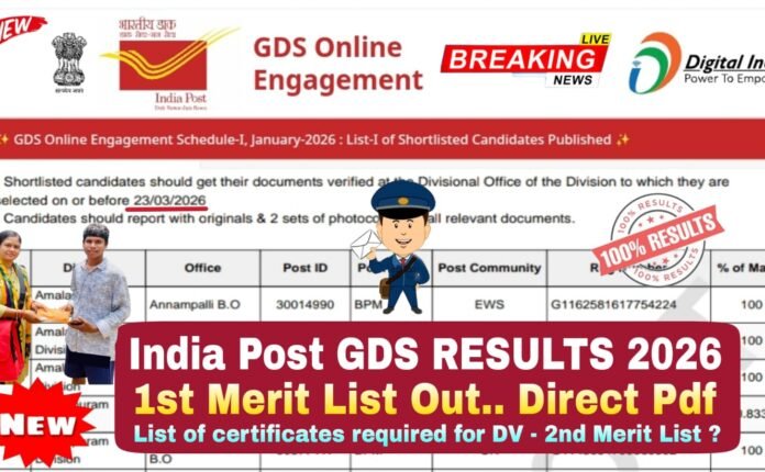 India Post GDS 1st Merit List 2026Direct Download Pdf : దేశంలోని తపాల శాఖలో గ్రామీణ డాక్ సేవక్ (GDS)  ఫలితాలు 06 మర్చి 2026 అధికార వెబ్సైట్ లో విడుదల చేశారు. వివరాల్లోకెతే…