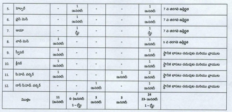 •మెసెంబర్, ఆఫీస్ సబార్డినట్, సానిటరీ మేస్త్రి, హెల్పర్, పి.హెచ్ వర్కర్ & క్లీనర్ :: 5వ, 7వ తరగతి ఉత్తీర్ణత.