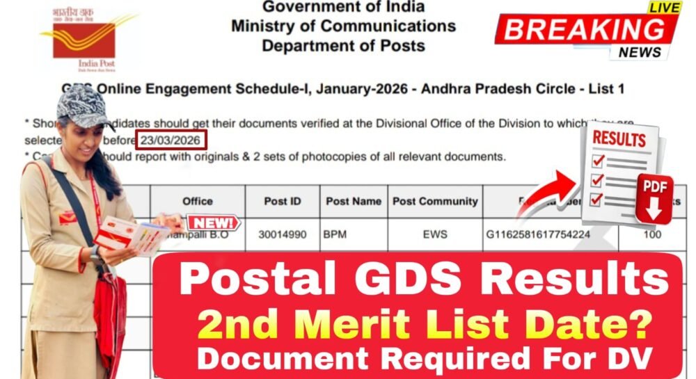భారత ప్రభుత్వం గ్రామీణ డాక్ సేవక్ (GDS) ఆన్లైన్ ఎంగేజ్మెంట్ షెడ్యూల్-I, జనవరి-2026 – ఆంధ్రప్రదేశ్ సర్కిల్ – జాబితా 1 & ఆంధ్రప్రదేశ్ సర్కిల్ – జాబితా 1 లో షార్ట్లిస్ట్ చేయబడిన అభ్యర్థులు 23/03/2026న లేదా అంతకు ముందు వారు ఎంపిక చేయబడిన డివిజన్లోని డివిజనల్ కార్యాలయంలో వారి పత్రాలను ధృవీకరించుకోవాలి. అభ్యర్థులు అన్ని సంబంధిత పత్రాల ఒరిజినల్స్ మరియు 2 సెట్ల ఫోటోకాపీలతో రిపోర్ట్ చేయాలి.