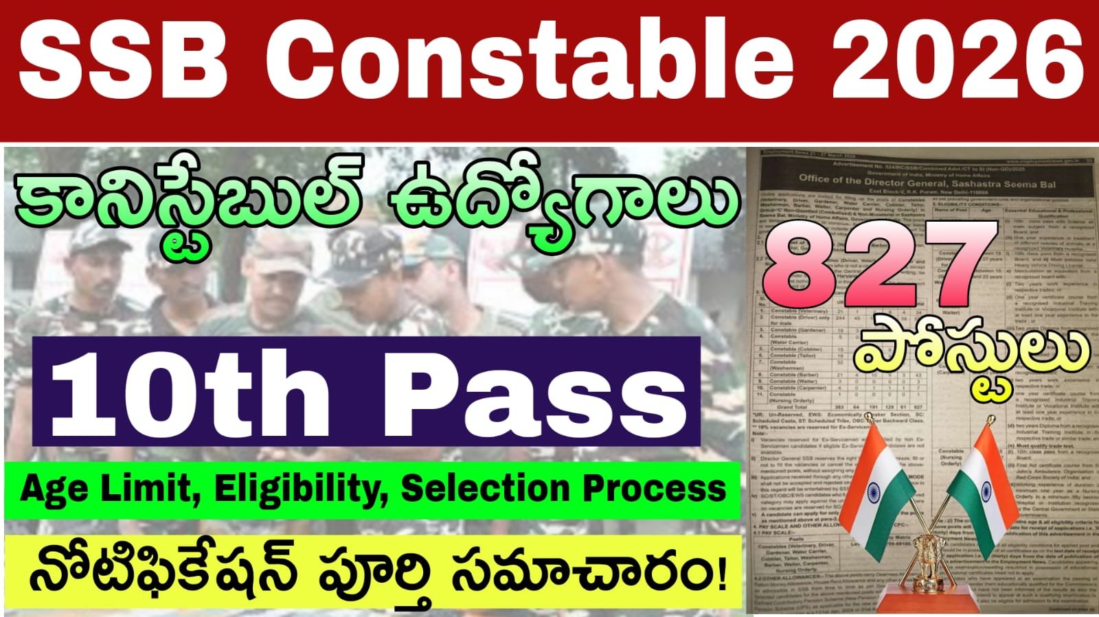 భారత ప్రభుత్వం, హోం మంత్రిత్వ శాఖ సశస్త్ర సీమా బల్ డైరెక్టర్ జనరల్ కార్యాలయం (SSB) లో 827 పోస్టులకు ఏప్రిల్ 19వ దరఖాస్తుల ప్రక్రియ ముగియనుంది. కానిస్టేబుల్ (పశువైద్యుడు, డ్రైవర్, తోటమాలి, నీటి క్యారియర్, చెప్పులు కుట్టేవాడు, దర్జీ, బట్టలు ఉతికేవాడు, క్షురకుడు, వడ్రంగి, వడ్రంగి & నర్సింగ్ ఆర్డర్లీ వంటి ఉద్యోగాలకు మెట్రిక్యులేషన్ ఉత్తీర్ణత సాధించి ఉండాలి. 21 మార్చి 2026 నాటికి వయసు 18-27 ఏళ్ల మధ్య ఉండాలి. వేతనం పే మ్యాట్రిక్స్ లెవల్-3లో బేసిక్ పే రూ.21,700-69,100 మధ్య ఉంటుంది. అభ్యర్థులు దరఖాస్తు ఫారమ్ నింపే ముందు SSB అధికారిక వెబ్‌సైట్ https://recruitment. ssb.gov.in/ & https://ssb.gov.in/ లలో అందుబాటులో ఉన్న సూచనలు మరియు వివరణాత్మక ప్రకటనను జాగ్రత్తగా చదవాలని సూచించారు.