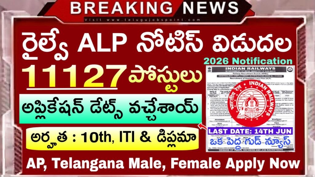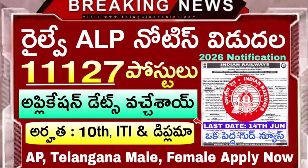 RRB Assistant Loco Pilot (ALP) Short notification 2026 Out : రైల్వే రిక్రూట్మెంట్ బోర్డులు (RRBలు) లో అసిస్టెంట్ లోకో పైలట్ (ALP) షార్ట్ నోటిఫికేషన్ RRB విడుదల చేసింది. మొత్తం ఖాళీలు (అన్ని రైల్వేలు) 11127 అసిస్టెంట్ లోకో పైలట్ (ALP) నియామకం ఉన్నాయి. ఆసక్తి, అర్హతగల పురుషులు, మహిళలు 14.06.2026 వరకు అప్లై చేసుకోవచ్చు. పోస్టులను బట్టి టెన్త్, ITI లేదా డిప్లొమా పూర్తిచేసిన అభ్యర్థులు అప్లై చేసుకోవచ్చు. వయస్సు (01.07.2026 నాటికి) 18-30ఏళ్లు. కంప్యూటర్ ఆధారిత పరీక్ష, రాతపరీక్ష, PFT, మెడికల్ టెస్ట్ & డాక్యుమెంట్ వెరిఫికేషన్ ద్వారా ఎంపిక చేస్తారు. ఫీజు: రూ.250 to 500/- + GST. ఆన్లైన్ మోడ్ https://www.rrbapply.gov.in/ ద్వారా మాత్రమే దరఖాస్తులను సమర్పించాలి.