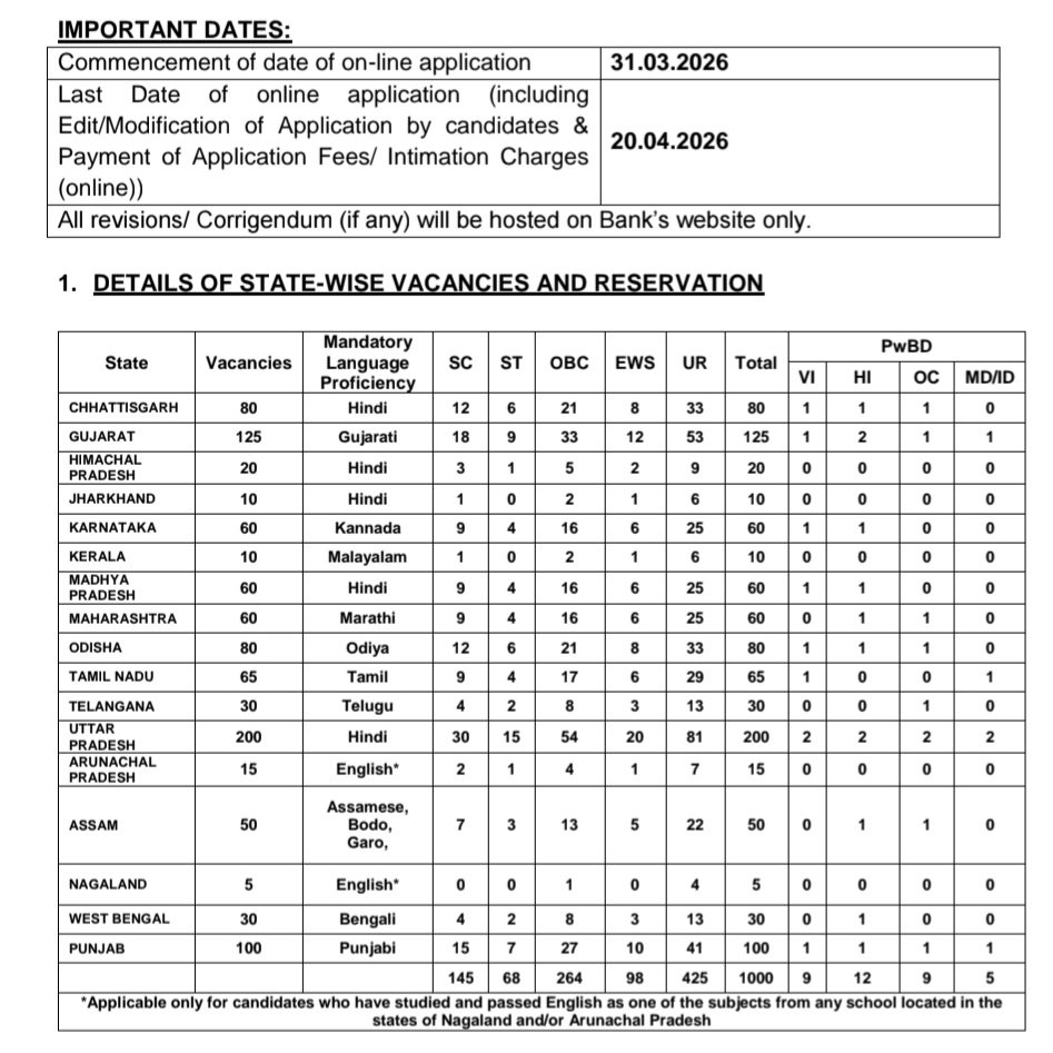 •ఈ నోటిఫికేషన్ లో జూనియర్ మేనేజ్మెంట్ స్కేల్1 (JMGS-I) లోకల్ బ్యాంక్ ఆఫీసర్ (LBO) ఉద్యోగాలు ఉన్నాయి. మొత్తం 1000 ఉద్యోగాలు ఉన్నాయి.