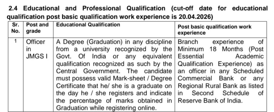 »విద్యా అర్హత ::  భారత ప్రభుత్వం గుర్తించిన విశ్వవిద్యాలయం నుండి ఏదైనా విభాగంలో డిగ్రీ (గ్రాడ్యుయేషన్) లేదా కేంద్ర ప్రభుత్వం గుర్తించిన దానికి సమానమైన అర్హత. అభ్యర్థి రిజిస్టర్ చేసుకునే రోజు నాటికి తాను గ్రాడ్యుయేట్ అని ధృవీకరించే చెల్లుబాటు అయ్యే మార్క్-షీట్/డిగ్రీ సర్టిఫికేట్‌ను కలిగి ఉండాలి మరియు ఆన్‌లైన్‌లో రిజిస్టర్ చేసుకునేటప్పుడు గ్రాడ్యుయేషన్‌లో పొందిన మార్కుల శాతాన్ని సూచించాలి. రిజర్వ్ బ్యాంక్ ఆఫ్ ఇండియా యొక్క రెండవ షెడ్యూల్‌లో జాబితా చేయబడిన ఏదైనా షెడ్యూల్డ్ కమర్షియల్ బ్యాంక్ లేదా ఏదైనా ప్రాంతీయ గ్రామీణ బ్యాంకులో అధికారిగా కనీసం 18 నెలల బ్రాంచ్ అనుభవం (అవసరమైన విద్యా అర్హత తర్వాత అనుభవం).