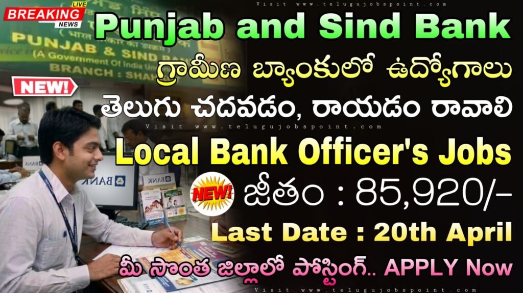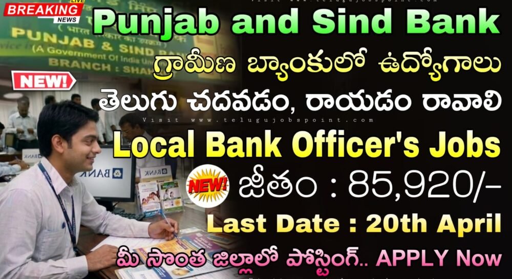 Punjab and Sind Bank Local Bank Officers JMGS I Job Recruitment 2026 Check Out The Eligibility Details Here And Apply Online Now: తెలుగు రాష్ట్రాలలో పంజాబ్ మరియు సింధ్ బ్యాంక్ లో 1000 లోకల్ బ్యాంక్ ఆఫీసర్ (LBO) JMGS I పోస్టుల కోసం పంజాబ్ అండ్ సింధు బ్యాంకు రిక్రూమెంట్ 2026 నోటిఫికేషన్ విడుదల అయింది. దరఖాస్తులు మర్చి 31 నుంచి ఏప్రిల్ 24 వరకు https://punjabandsind.bank.in/ ఆన్లైన్లో దరఖాస్తు ఆహ్వానిస్తున్నారు. ఈ నోటిఫికేషన్ లో 20 నుంచి 30 సంవత్సరాల వయసు గల అర్హులైన అభ్యర్థులు ఆన్లైన్లో దరఖాస్తు చేసుకోవచ్చు. రాత పరీక్ష, ఇంటర్వ్యూ & స్థానిక భాషా ప్రావీణ్యత కలిగిన అభ్యర్థులు ఈ ఉద్యోగాలకు అప్లై చేసుకోవచ్చు.