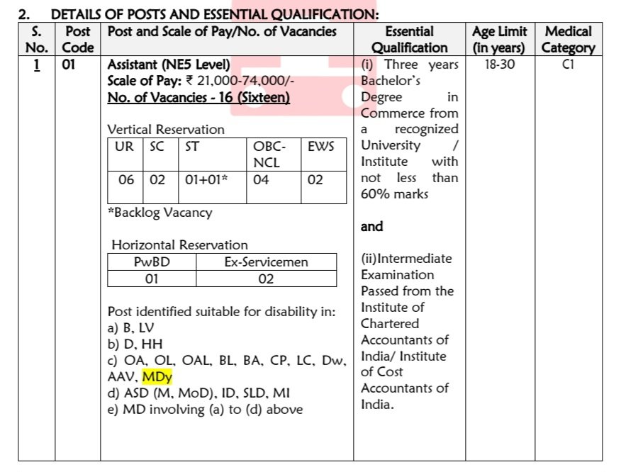 అసిస్టెంట్ :: గుర్తింపు పొందిన విశ్వవిద్యాలయం/సంస్థ నుండి కామర్స్‌లో బ్యాచిలర్ డిగ్రీ, 60% కంటే తక్కువ కాకుండా మార్కులు లేదా ఇన్‌స్టిట్యూట్ ఆఫ్ చార్టర్డ్ అకౌంటెంట్స్ ఆఫ్ ఇండియా/ ఇన్‌స్టిట్యూట్ ఆఫ్ కాస్ట్ నుండి ఇంటర్మీడియట్ పరీక్షలో ఉత్తీర్ణత అకౌంటెంట్స్ ఆఫ్ ఇండియా.