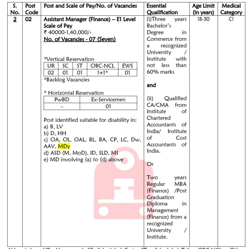 అసిస్టెంట్ మేనేజర్/ఫైనాన్స్ (E-1 స్థాయి) :: పొందిన విశ్వవిద్యాలయం / సంస్థ నుండి 60% కంటే తక్కువ కాకుండా మార్కులతో మూడు సంవత్సరాల బ్యాచిలర్ డిగ్రీ కామర్స్. మరియు ఇన్‌స్టిట్యూట్ చార్టర్డ్ అకౌంటెంట్స్ ఆఫ్ ఇండియా/ ఇన్‌స్టిట్యూట్ కాస్ట్ అకౌంటెంట్స్ ఆఫ్ ఇండియా నుండి అర్హత పొందిన CA/CMA. లేదా గుర్తింపు పొందిన విశ్వవిద్యాలయ సంస్థ నుండి రెండు సంవత్సరాల రెగ్యులర్ MBA (ఫైనాన్స్) / పోస్ట్ గ్రాడ్యుయేషన్ డిప్లొమా ఇన్ మేనేజ్‌మెంట్ (ఫైనాన్స్).