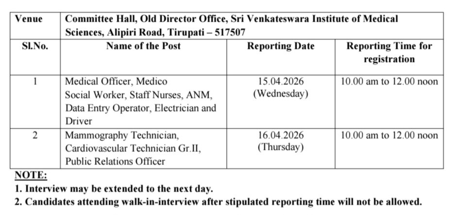 TTD SVIMS Recruitment 2026 Latest DEO, ANM, Staff Nurses & Driver Job Notification 2026 Apply Now : ఆంధ్రప్రదేశ్, తిరుమల తిరుపతి ఆధ్వర్యం(TTD) లో తిరుపతి జిల్లాలోని శ్రీ వెంకటేశ్వర వైద్య విజ్ఞాన సంస్థ (SVIMS)లో “వైద్య అధికారులు, స్టాఫ్ నర్సులు, ANM, మామోగ్రఫీ టెక్నీషియన్,  కార్డియోవాస్కులర్ టెక్నీషియన్ గ్రేడ్ II, DEO, PRO,  MSW, ఎలక్ట్రీషియన్ & డ్రైవర్ ఉద్యోగుల కోసం వాక్-ఇన్-ఇంటర్వ్యూలు ఒప్పంద ప్రాతిపదికన క్రింది పోస్టుల కోసం అర్హులైన అభ్యర్థుల నుండి దరఖాస్తులు ఆహ్వానించబడ్డాయి. ఆసక్తిగల అభ్యర్థులు దరఖాస్తు ఫారంలో పేర్కొన్న విధంగా ఒరిజినల్ సర్టిఫికేట్‌లతో పాటు ఒక సెట్ ఫోటోస్టాట్ కాపీలను మరియు రెండు ఇతర పత్రాలను వెంట తీసుకుని 15, 16.04.2026 వాక్-ఇన్-ఇంటర్వ్యూకు హాజరు కావాలని సూచించడమైనది.