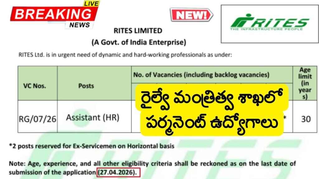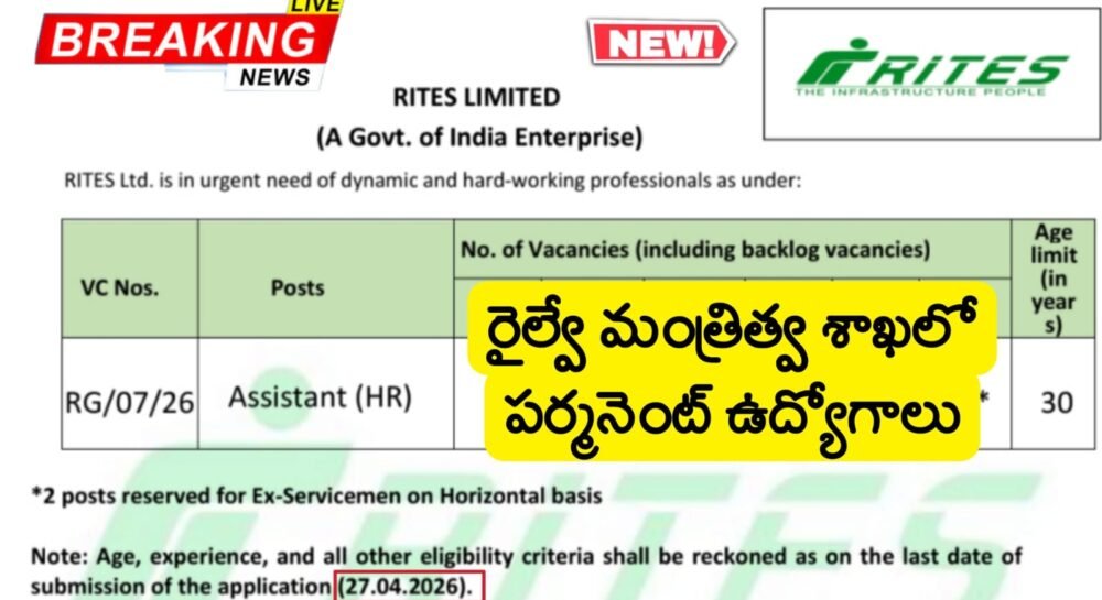 RITES Ltd Recruitment 2026 Latest Assistant Job Notification 2026 Apply Now : భారత ప్రభుత్వ రైల్వే మంత్రిత్వ శాఖ ఆధ్వర్యంలోని నవరత్న కేంద్ర ప్రభుత్వ రంగ సంస్థ అయిన రైట్స్ లిమిటెడ్ లో అసిస్టెంట్ (HR) ఉద్యోగుల కోసం నోటిఫికేషన్ విడుదల చేశారు. ఆన్లైన్ దరఖాస్తు మరియు ఆన్లైన్ సమర్పణకు చివరి తేదీ 27.04.2026 లోపు ఆసక్తిగల అభ్యర్థులు RITES వెబ్సైట్, http://www.rites.com లోని కెరీర్ విభాగంలో అందుబాటులో ఉన్న రిజిస్ట్రేషన్ ఫార్మాట్లో ఆన్లైన్లో దరఖాస్తు చేసుకోవాలి.