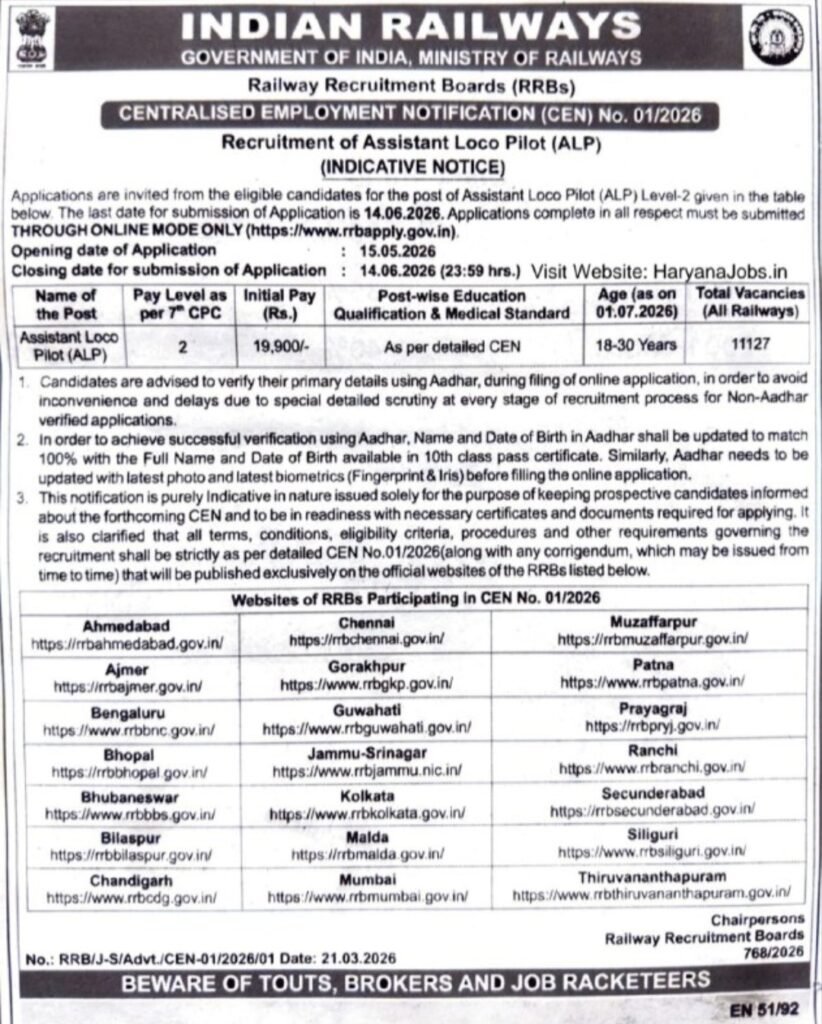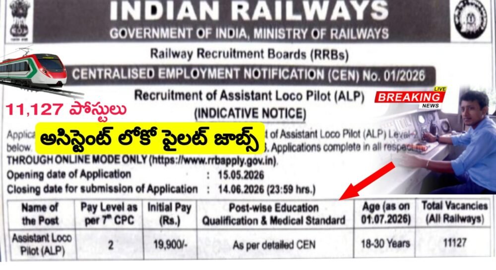 RRB NTPC Recruitment 2026 Latest Assistant Loco Pilot Short Notification 2026 Apply Now : నిరుద్యోగుల కోసం రైల్వే శాఖలో త్వరలో 11,127 అసిస్టెంట్ లోకో పైలట్ ఉద్యోగుల కోసం నోటిఫికేషన్ విడుదల చేయనున్నది. భారత ప్రభుత్వం, రైల్వే మంత్రిత్వ శాఖ, రైల్వే రిక్రూట్మెంట్ బోర్డులు (RRB) ఉపాధి ప్రకటన (CEN) నెం. 01/2026 ప్రకారం అసిస్టెంట్ లోకో పైలట్ (ALP) నియామకం కోసం షార్ట్ నోటిఫికేషన్ విడుదల చేశారు. ఈ షార్ట్ నోటిఫికేషన్ ప్రకారం దరఖాస్తు ప్రారంభ తేదీ : 15.05.2026 నుంచి దరఖాస్తులను సమర్పించడానికి చివరి తేదీ 14.06.2026 (23:59 గంటలు) లోపు వెబ్సైట్ను https://www.rrbapply.gov.in సందర్శించండి.