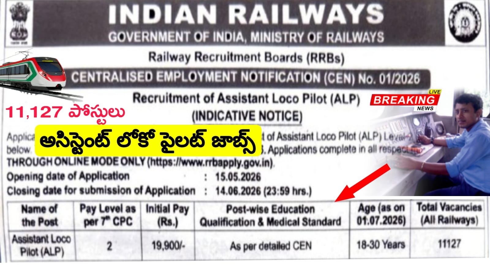 RRB NTPC Recruitment 2026 Latest Assistant Loco Pilot Short Notification 2026 Apply Now : నిరుద్యోగుల కోసం రైల్వే శాఖలో త్వరలో 11,127 అసిస్టెంట్ లోకో పైలట్ ఉద్యోగుల కోసం నోటిఫికేషన్ విడుదల చేయనున్నది. భారత ప్రభుత్వం, రైల్వే మంత్రిత్వ శాఖ, రైల్వే రిక్రూట్మెంట్ బోర్డులు (RRB) ఉపాధి ప్రకటన (CEN) నెం. 01/2026 ప్రకారం అసిస్టెంట్ లోకో పైలట్ (ALP) నియామకం కోసం షార్ట్ నోటిఫికేషన్ విడుదల చేశారు. ఈ షార్ట్ నోటిఫికేషన్ ప్రకారం దరఖాస్తు ప్రారంభ తేదీ : 15.05.2026 నుంచి దరఖాస్తులను సమర్పించడానికి చివరి తేదీ 14.06.2026 (23:59 గంటలు) లోపు వెబ్సైట్ను https://www.rrbapply.gov.in సందర్శించండి.