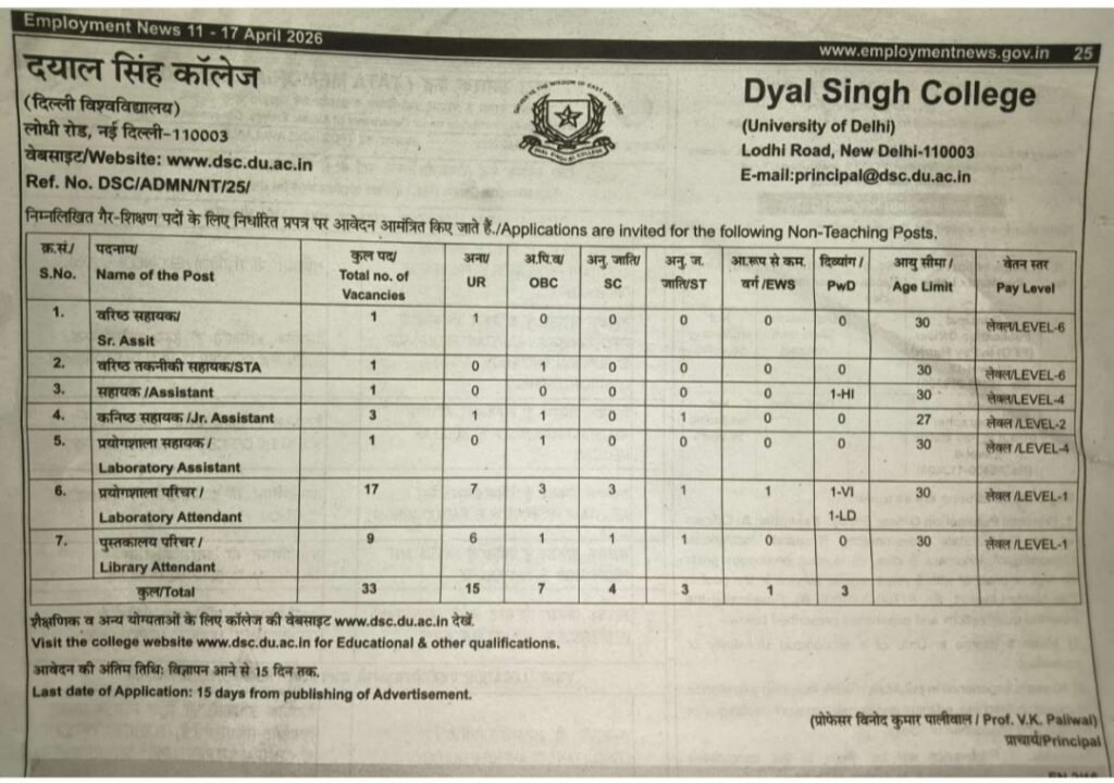 దయాల్ సింగ్ కళాశాల లో సీనియర్ అసిస్టెంట్, సీనియర్ టెక్నికల్ అసిస్టెంట్, అసిస్టెంట్, జూనియర్ అసిస్టెంట్ & ల్యాబొరేటరీ అసిస్టెంట్ మొత్తం 33 పోస్టుల భర్తీకి ఎంప్లాయిమెంట్ న్యూస్ 11-17 ఏప్రిల్ 2026 లో 25 నెంబర్ పేజీలో షార్ట్ నోటిఫికేషన్ రిలీజ్ చేసింది. 10th, 10+2, ANY డిగ్రీ అర్హతతో ఉద్యోగాలను భర్తీ చేయనుంది. అప్లికేషన్ 11 ఏప్రిల్ 2025 నుంచి దరఖాస్తులు ప్రారంభమయ్యాయి. చివరి తేదీ ఏప్రిల్ 26. ఈ ఉద్యోగులకు రెండు తెలుగు రాష్ట్ర అభ్యర్థులు అప్లై చేసుకోవచ్చు. విద్యా & ఇతర అర్హతల కోసం కళాశాల వెబ్సైట్ www.dsc.du.ac.inని సందర్శించండి.