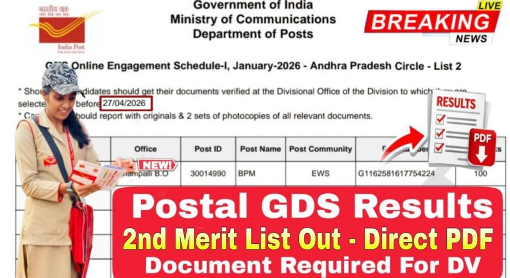 గ్రామీణ డాక్ సేవక్ (GDS) ఉద్యోగాలకు https://indiapost.gov.in/gdsonlineengagement అధికార వెబ్సైట్ ద్వారా ఇండియన్ పోస్ట్ GDS 2nd మెరిట్ జాబితా విడుదల చేసింది. షార్ట్ లిస్టులో పేరు ఉన్నట్లయితే డాక్యుమెంట్ వెరిఫికేషన్ (DV) కోసం 27 ఏప్రిల్ 2026లోపు హాజరు కావాలి.