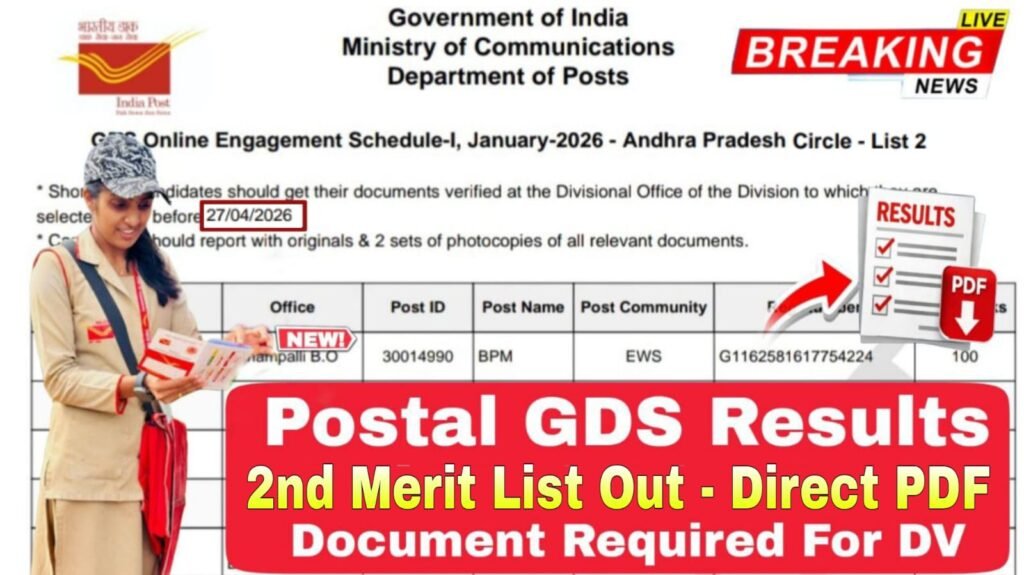 India Post GDS Result 2nd List : కేంద్ర ప్రభుత్వ ఆధ్వర్యంలో దేశంలో వివిధ తపాల శాఖలో గ్రామీణ డాక్ సేవక్ (GDS) ఉద్యోగులకు సంబంధించి 2nd మెరిట్ జాబితా 10 ఏప్రిల్ విడుదల చేయడం జరిగింది. ఈ నోటిఫికేషన్ లో బ్రాంచ్ పోస్ట్ మాస్టర్, అసిస్టెంట్ బ్రాంచ్ పోస్ట్ మాస్టర్ & డాట్ సేవకు ఉద్యోగాలకు GDS 2nd మెరిట్ లిస్ట్ అధికారకంగా విడుదల చేశారు. ఈ ఉద్యోగాలకు కేవలం 10వ తరగతి అర్హత ఆధారంగా ఎటువంటి రాత పరీక్ష లేకుండా ఎంపిక చేస్తున్నారు. మొత్తం ఆంధ్రప్రదేశ్ లో 1060 ఉద్యోగాలు కాను 555 మంది, తెలంగాణలో 608 ఉద్యోగాలకు కాను 214 మంది 2nd మెరిట్ లిస్టులో సెలెక్ట్ అయ్యారు. ఈ ఉద్యోగాలకు అధికార https://indiapost.gov.in/gdsonlineengagement వెబ్సైట్ లో 2nd మెరిట్ లిస్ట్ అందుబాటులో ఉంది. ఈ ఉద్యోగాలకు కంప్యూటర్ జనరేటర్ పద్ధతి పైన మార్కులు, రూల్ ఆఫ్ రిజర్వేషన్ ఆధారంగా సెలక్షన్ చేశారు. గ్రామీణ డాక్ సేవక్ (GDS) ఉద్యోగులకు షార్ట్ లిస్ట్ అయిన అభ్యర్థులు ఈనెల ఏప్రిల్ 27వ తేదీలోగా తమకు ఇచ్చినటువంటి డివిజన్ కార్యాలయంలో డాక్యుమెంట్ వెరిఫికేషన్ చేసుకోవాల్సి ఉంటుంది. ఈ డాక్యుమెంట్ వెరిఫికేషన్ లో అభ్యర్థులు డాక్యుమెంట్ వెరిఫికేషన్ చేసుకోవడం వల్ల బ్రాంచ్ పోస్ట్ మాస్టర్ (BPM), అసిస్టెంట్ బ్రాంచ్ పోస్ట్ మాస్టర్ (ABPM) & డాట్ సేవకు ఉద్యోగాలకు ఎంపిక అవుతారు. 27 ఏప్రిల్ 2026 2nd మెరిట్ లిస్టులో డాక్యుమెంట్ వెరిఫికేషన్ చేసుకోకుండా హాజరు కాకపోతే మిగిలినటువంటి పోస్టులు కోసం మార్చి లాస్ట్ వీక్ లో 3rd మెరిట్ లిస్టు వచ్చే అవకాశం ఉంది.