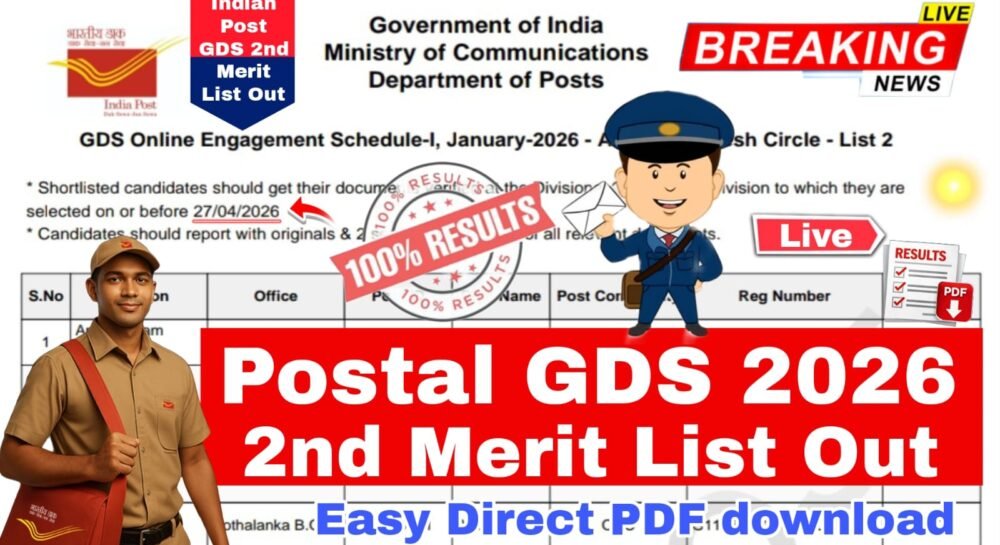 Indian Postal GDS 2nd Merit List 2026 Release Check State Wise GDS 2nd Merit List All Details In Telugu : భారత తపాలా శాఖ గ్రామీణ డాక్ సేవక్ (GDS) 2nd మెరిట్ జాబితాను https://indiapost.gov.in/gdsonlineengagement అధికారిక వెబ్సైట్లో 10 ఏప్రిల్ 2026 విడుదల చేశారు. 2nd మెరిట్ లిస్ట్ లో ఆంధ్రప్రదేశ్ 1060 ఉద్యోగాలు కాను 555 మంది మరియు తెలంగాణ లో 608 ఉద్యోగాలు కాను 214 విద్యార్థులు GDS 2nd మెరిట్ లిస్టులో సెలెక్ట్ అయ్యారు. సెలెక్ట్ అయిన అభ్యర్థులు వెంటనే డాక్యుమెంట్ వెరిఫికేషన్ చేసుకోవాలి. ఎలా అనేది ఇప్పుడు పూర్తిగా తెలుసుకుందాం…