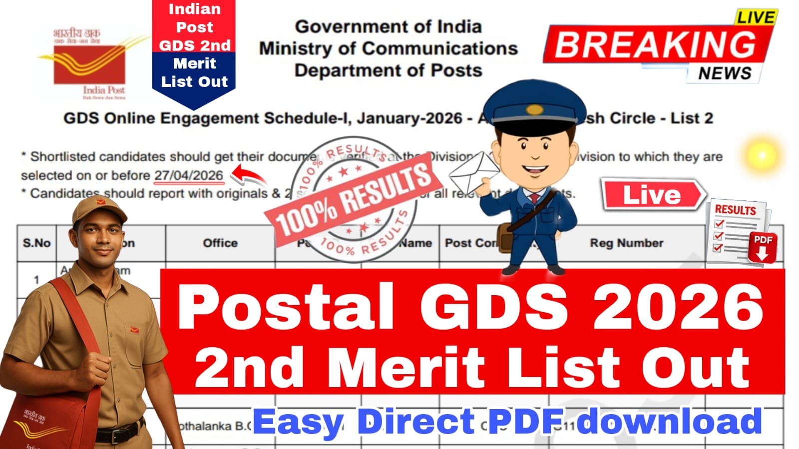 Indian Postal GDS 2nd Merit List 2026 Release Check State Wise GDS 2nd Merit List All Details In Telugu : భారత తపాలా శాఖ గ్రామీణ డాక్ సేవక్ (GDS) 2nd మెరిట్ జాబితాను https://indiapost.gov.in/gdsonlineengagement అధికారిక వెబ్సైట్లో 10 ఏప్రిల్ 2026 విడుదల చేశారు. 2nd మెరిట్ లిస్ట్ లో ఆంధ్రప్రదేశ్ 1060 ఉద్యోగాలు కాను 555 మంది మరియు తెలంగాణ లో 608 ఉద్యోగాలు కాను 214 విద్యార్థులు GDS 2nd మెరిట్ లిస్టులో సెలెక్ట్ అయ్యారు. సెలెక్ట్ అయిన అభ్యర్థులు వెంటనే డాక్యుమెంట్ వెరిఫికేషన్ చేసుకోవాలి. ఎలా అనేది ఇప్పుడు పూర్తిగా తెలుసుకుందాం…