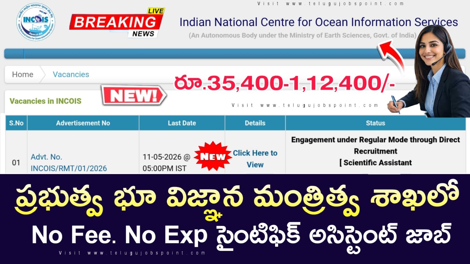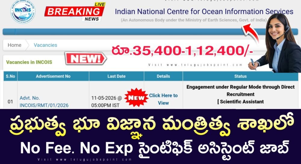 INCOIS Recruitment 2026 Latest Scientific Assistant Notification 2026 Apply Now: ఇండియన్ నేషనల్ సెంటర్ ఫర్ ఓషన్ ఇన్ఫర్మేషన్ సర్వీసెస్ (INCOIS) లో Scientist ‘C & సైంటిఫిక్ అసిస్టెంట్ రెగ్యులర్ పద్ధతిలో ఎంపిక కోసం అర్హులైన భారతీయ పౌరుల నుండి దరఖాస్తులను ఆహ్వానిస్తోంది.
