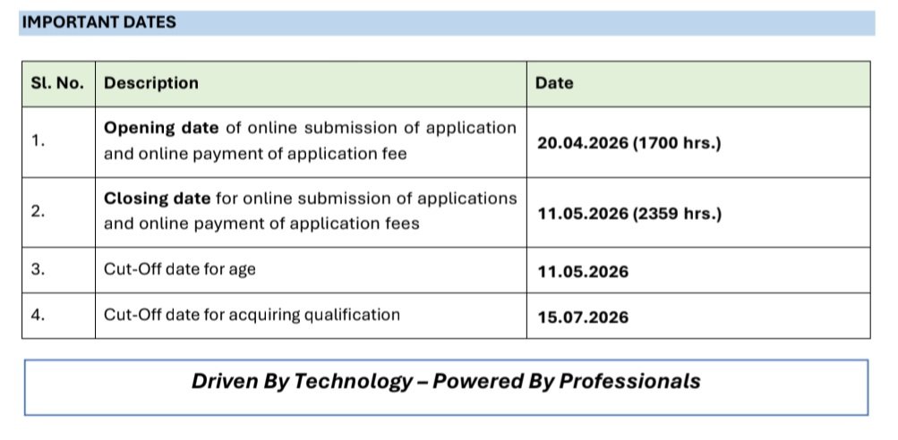 ఆన్‌లైన్‌లో దరఖాస్తు సమర్పణ మరియు దరఖాస్తు రుసుము చెల్లింపు ప్రారంభ తేదీ:  20.04.2026 (1700 గంటలు)