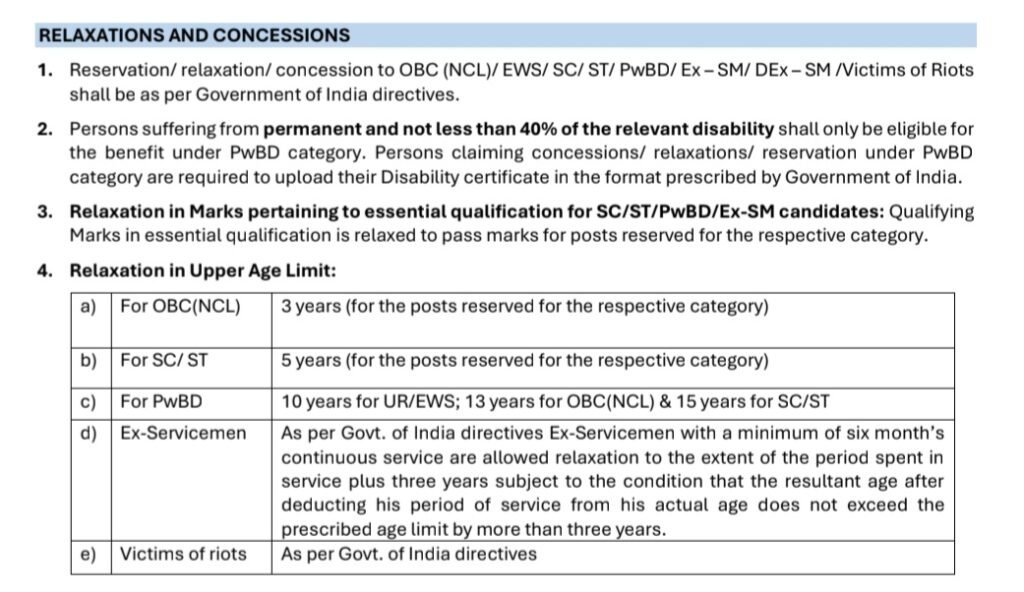 Junior Officer Trainee (HR) – JOT (HR) :: జనరల్/EWS/OBC (NCL) కేటగిరీ అభ్యర్థులకు గుర్తింపు పొందిన సంస్థ/విశ్వవిద్యాలయం నుండి 60% కంటే తక్కువ కాకుండా మార్కులతో మూడు సంవత్సరాల పూర్తికాల గ్రాడ్యుయేట్ రెగ్యులర్ డిగ్రీ BBA/ BBM/ BBS లేదా తత్సమాన అర్హత. పోస్ట్ గ్రాడ్యుయేట్ డిగ్రీ/డిప్లొమా లేదా దానికి సమానమైన ఉన్నత విద్యా అర్హత ఉన్న అభ్యర్థులు సదరు పోస్టుకు దరఖాస్తు చేసుకోవడానికి అనుమతించబడరు.