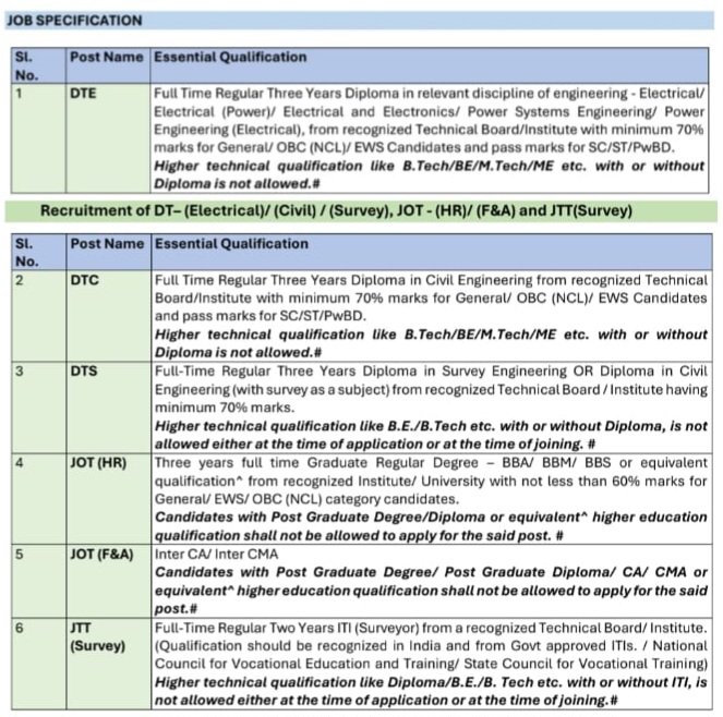 Diploma Trainee (Electrical) – DTE : గుర్తింపు పొందిన టెక్నికల్ బోర్డ్/ఇన్‌స్టిట్యూట్ నుండి సంబంధిత ఇంజనీరింగ్ విభాగంలో – ఎలక్ట్రికల్/ఎలక్ట్రికల్ (పవర్)/ఎలక్ట్రికల్ అండ్ ఎలక్ట్రానిక్స్/పవర్ సిస్టమ్స్ ఇంజనీరింగ్/పవర్ ఇంజనీరింగ్ (ఎలక్ట్రికల్) – పూర్తికాల రెగ్యులర్ మూడేళ్ల డిప్లొమా, జనరల్/ఓబీసీ (ఎన్‌సీఎల్)/ఈడబ్ల్యూఎస్ అభ్యర్థులకు కనీసం 70% మార్కులతో మరియు ఎస్సీ/ఎస్టీ/పీడబ్ల్యూబీడీ అభ్యర్థులకు పాస్ మార్కులతో ఉత్తీర్ణులై ఉండాలి. B.Tech/BE/M.Tech/ME మొదలైన ఉన్నత సాంకేతిక అర్హతతో లేదా లేకుండా డిప్లొమా అనుమతించబడదు.