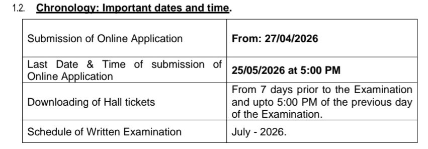 •ఆన్లైన్ దరఖాస్తు సమర్పణకు చివరి తేదీ మరియు సమయం :: 25/05/2026 సాయంత్రం 5:00 గంటలకు