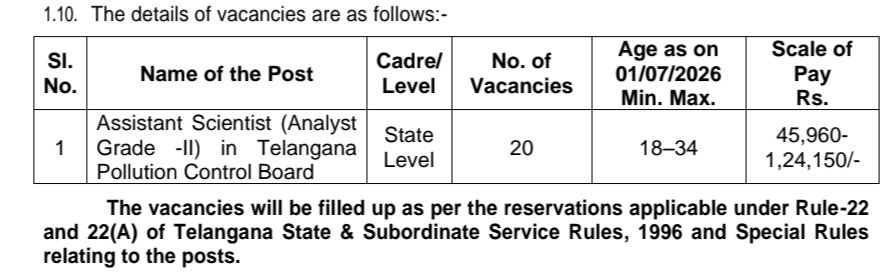 •తెలంగాణ కాలుష్య నియంత్రణ బోర్డులో అసిస్టెంట్ సైంటిస్ట్ (అనలిస్ట్ గ్రేడ్ -II) రిక్రూట్మెంట్-2026 ద్వారా 20 ఖాళీలను భర్తీ చేయనున్నారు.
