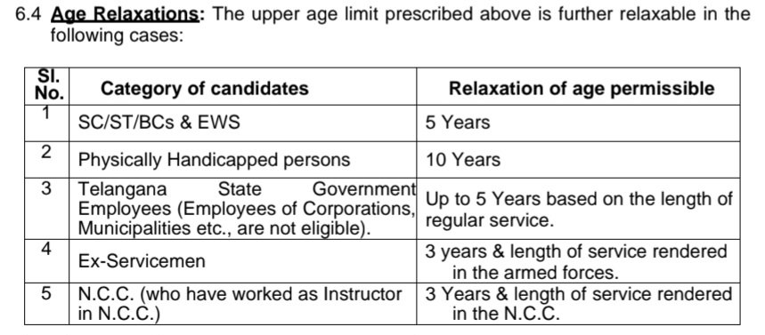 •కనీస వయస్సు (18 సంవత్సరాలు) కొరకు, దరఖాస్తుదారు 01/07/2008 తర్వాత జన్మించి ఉండకూడదు. గరిష్ట వయస్సు (34 సంవత్సరాలు) కొరకు, దరఖాస్తుదారు 02/07/1992 కి ముందు జన్మించి ఉండకూడదు. వయో సడలింపులు: పైన సూచించిన గరిష్ట వయోపరిమితిని ఈ క్రింది సందర్భాలలో మరింత సడలించవచ్చు: