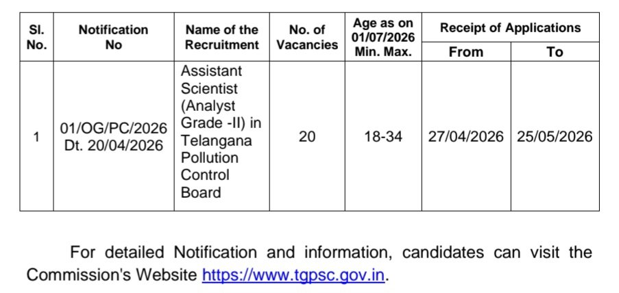 Telangana Pollution Control Board Recruitment 2026 Latest TGPSC Assistant Scientist Notification 2026 Apply Now: తెలంగాణ రాష్ట్రంలోని తెలంగాణ కాలుష్య నియంత్రణ బోర్డులో అసిస్టెంట్ సైంటిస్ట్ (అనలిస్ట్ గ్రేడ్ -II) పోస్టుల కోసం అర్హులైన అభ్యర్థుల నుండి, దరఖాస్తుల స్వీకరణ 27/04/2026 నుండి 25/05/2026 కమిషన్ వెబ్సైట్ https://www.tgpsc.gov.in లో అందుబాటులో ఉంచబడిన నమూనా దరఖాస్తు ద్వారా ఆన్లైన్లో దరఖాస్తులు ఆహ్వానించబడ్డాయి.