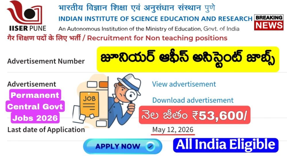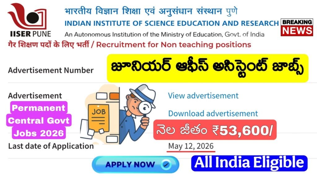 IISER Jobs : Any డిగ్రీ అర్హతతో జూనియర్ ఆఫీస్ అసిస్టెంట్ ఉద్యోగ నోటిఫికేషన్ వచ్చేసింది | IISER Pune Non teaching Recruitment 2026 Apply Online Now