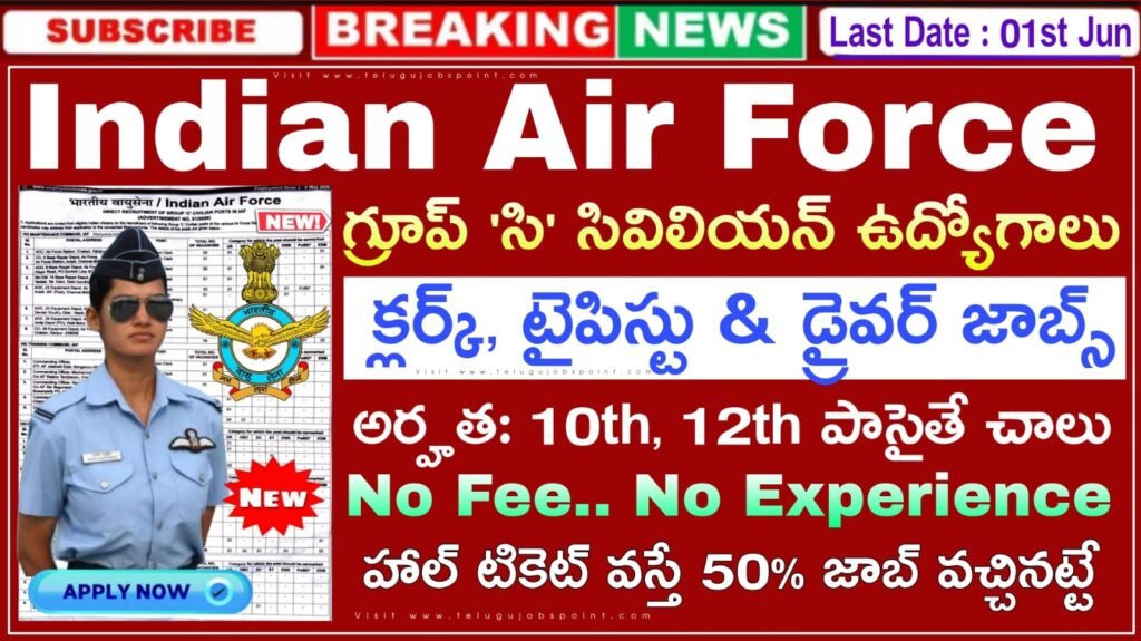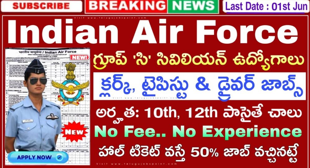 Indian Air Force Group ‘C’ Civilian Recruitment 2026 Latest Lower Division Clerk, Driver & Hindi Typist Jobs Notification 2026 Salary, eligibility, apply links: భారతీయ వాయుసేన / ఇండియన్ ఎయిర్ ఫోర్స్, ఐఏఎఫ్‌లో గ్రూప్ ‘సి’ పౌర పోస్టుల ప్రత్యక్ష నియామకం వైమానిక దళ స్టేషన్లు/యూనిట్లలో లోయర్ డివిజన్ క్లర్క్, పౌర మెకానికల్ రవాణా డ్రైవర్ (సాధారణ గ్రేడ్) & హిందీ టైపిస్ట్ సంబంధిత స్టేషన్లు/యూనిట్ల లో గ్రూప్ ‘సి’ సివిటాన్ పోస్టుల నియామకం కోసం అర్హులైన భారత పౌరుల నుండి దరఖాస్తులు ఆహ్వానించబడ్డాయి. అప్లై చేయడానికి చివరి తేదీ 01 జూన్ 2026.