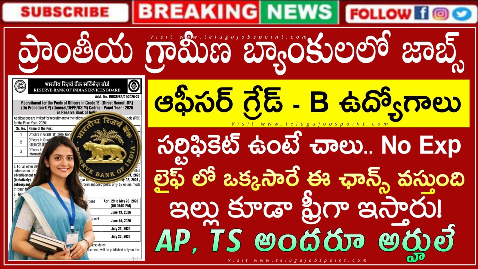 Reserve Bank of India Job Recruitment 2026 Latest RBI Officers in Grade ‘B’ Notification 2026 Apply Now : నిరుద్యోగులకు భారీ నోటిఫికేషన్.. రిజర్వ్ బ్యాంక్ ఆఫ్ ఇండియా (RBI)లో గ్రేడ్ ‘బి’ (డైరెక్ట్ రిక్రూట్-డిఆర్) (ప్రొబేషన్పై-ఓపి) (జనరల్/డిఇపిఆర్/డిఎస్ఐఎం) కేడర్లలోని ఆఫీసర్ల 60 పోస్టుల భర్తీ నోటిఫికేషన్ వచ్చేసింది. ఇతర వివరాల కోసం, దయచేసి ఏప్రిల్ 29, 2026 (తాత్కాలికంగా) తేదీన బ్యాంక్ వెబ్సైట్ (www.rbi.org.in)లో ఆన్లైన్ విధానంలో మాత్రమే దరఖాస్తు చేసుకోవచ్చు.